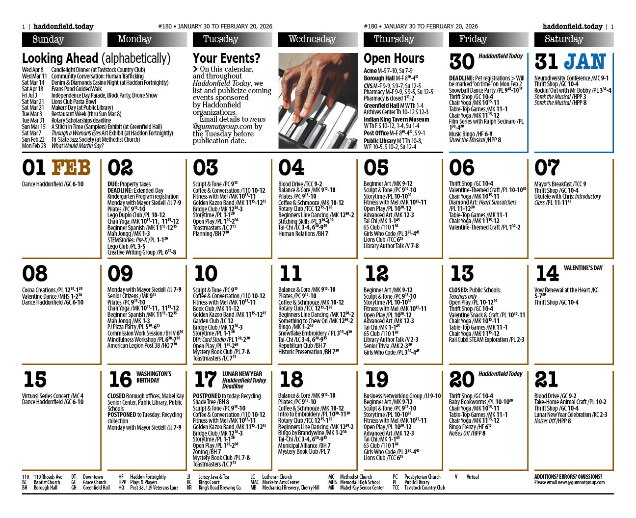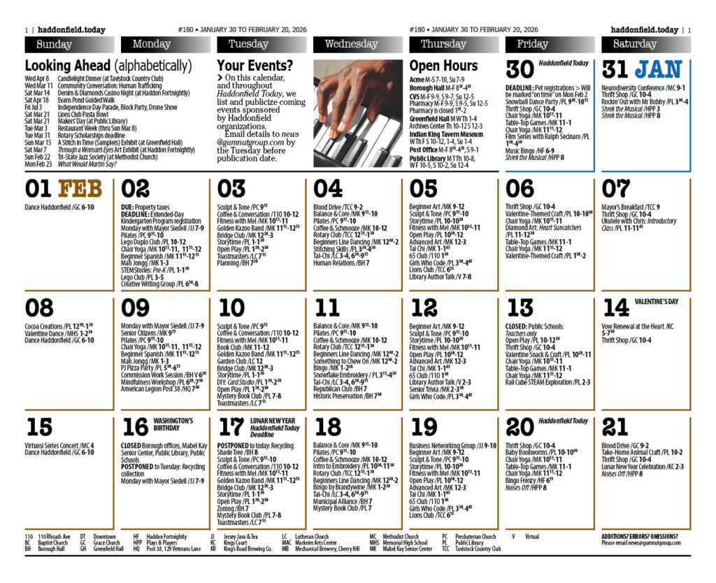 Haddonfield Town Calendar Rollover the dates to zoom in on the information. Haddonfield Calendar – January/February 2026 Quick Contacts