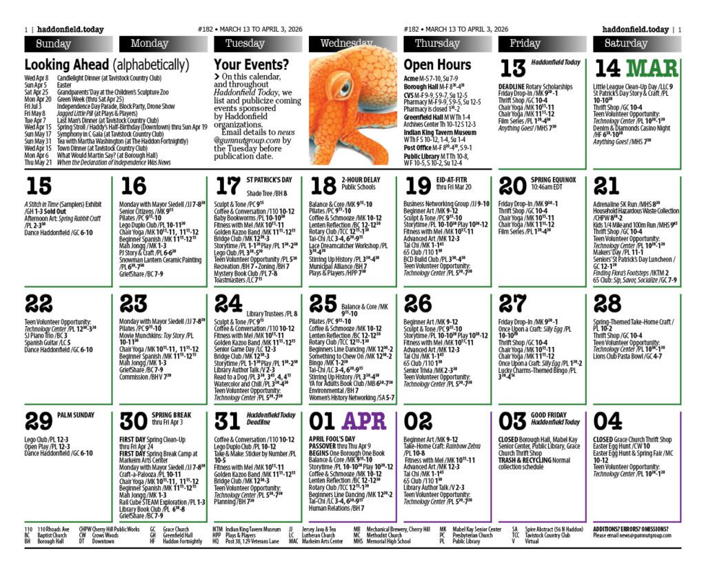 Haddonfield Town Calendar Rollover the dates to zoom in on the information. Haddonfield Calendar – March/April 2026 Quick Contacts